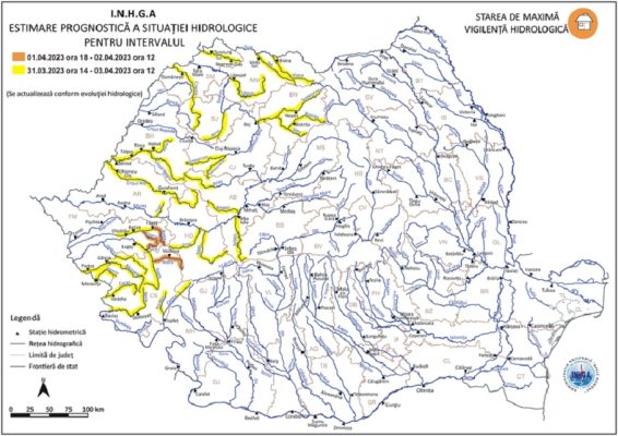 Potrivit specialiştilor, de asemenea, în intervalul 31.03.2023 ora 14:00 – 03.04.2023 ora 12:00, va fi cod galben, pe râuri din bazinele hidrografice: Tur (judeţul Satu Mare), Crasna (judeţele: Sălaj şi Satu Mare), Crişul Negru (judeţele: Bihor şi Arad), Crişul Alb (judeţele: Hunedoara şi Arad), Arieş (judeţele: Alba şi Cluj), Bega (judeţul Timiş) şi Timiş (judeţele: Caraş Severin şi Timiş).