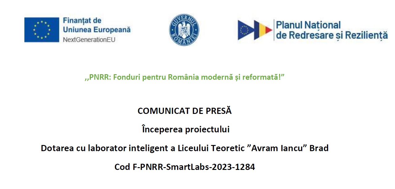 Beneficiar: Liceul Teoretic ”Avram Iancu” Brad, județul Hunedoara, în calitate de beneficiar anunță începerea proiectului ”Dotarea cu laborator inteligent a Liceului Teoretic ”Avram Iancu” Brad” cod F-PNRR-SmartLabs-2023-1284 finanțat prin Unitatea Executivă pentru Finanțarea Învățământului Superior, a Cercetării, Dezvoltării și Inovării, în cadrul apelului ”Dotarea cu laboratoare inteligente a unităților de învățământ secundar superior, a palatelor și a cluburilor copiilor”, prin PNRR / Pilonul VI. Politici pentru noua generație / Componenta C15: Educație / Reforma 5. Adoptarea cadrului legislativ pentru digitalizarea educației / Investiția 9. Asigurarea echipamentelor și a resurselor tehnologice digitale pentru unitățile de învățămînt.