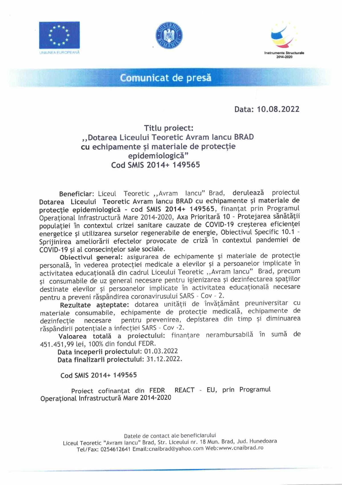 ACTUALITATECOMUNICATE DE PRESĂ Comunicat de presă – Liceul Teoretic „AVRAM IANCU” Brad 10 august 2022 Redacția Replica