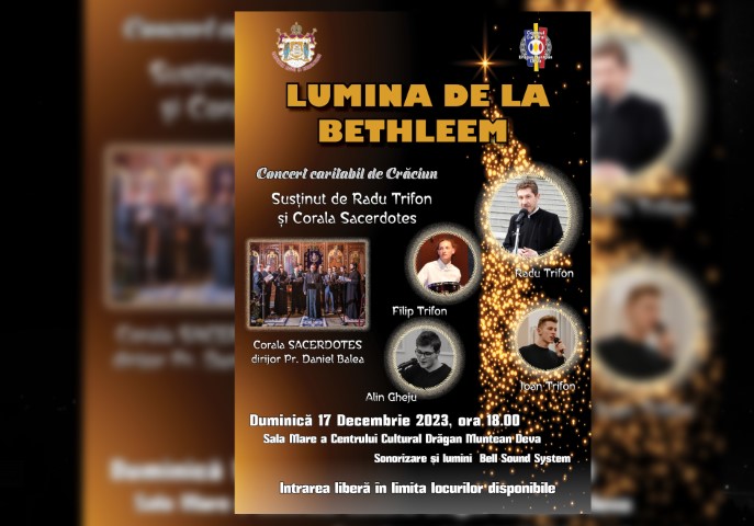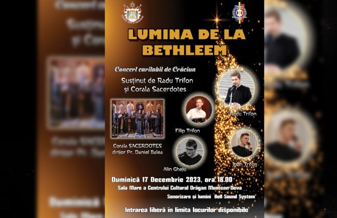 Episcopia Devei și Hunedoarei în colaborare cu Primăria Municipiului Deva și Centrul Cultural „Drăgan Muntean” din Deva au bucuria de a vă invita în data de 17 decembrie 2023, începând cu ora 18:00, la concertul caritabil de Crăciun „LUMINA DE LA BETHLEEM”, susținut de părintele Radu Trifon, consilier cultural al eparhiei hunedorene, alături de invitații săi: Corala „SACERDOTES” a preoților din Episcopia Devei și Hunedoarei și tinerii muzicieni Alin Gheju, Filip și Ioan Trifon.