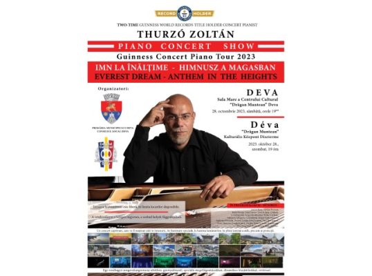 Pianistul orădean Thurzo Zoltan, deţinător a două titluri mondiale „Guinness World Records” va susține concertul într-o atmosferă atipică, cu show de lumini, piese interpretate și improvizate live, atât în întuneric, în iluminare specială, la lumina lumânărilor, cât și în plină lumină în Sala Mare a Centrului Cultural „Drăgan Muntean” Deva.