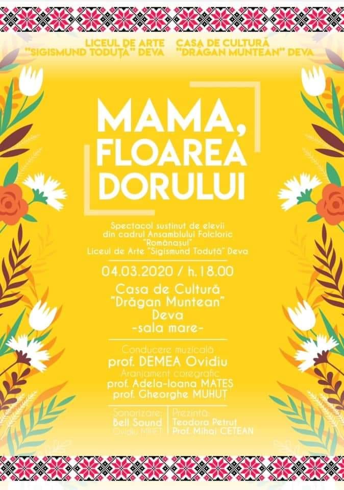 Cel de-al doilea eveniment este spectacolul intitulat “Mama, floarea dorului” susținut de Ansamblul folcloric “Românaşul”, care va avea loc la sala mare a Centrului Cultural “Drăgan Muntean” în data de 4 martie 2020, ora 18.00. În cadrul spectacolului vor evolua elevi de liceu ai secțiilor de muzică vocală tradițională şi instrumente populare, precum şi elevi din clasele I-IV pasionați de folclor. Sub conducerea muzicală a profesorului Ioan Ovidiu Demea şi în aranjamentul coregrafic al profesorilor Adela-Ioana Mateş şi Ioan Mihuț, Ansamblul “Românaşul” va prezenta un buchet de cântece dedicate Zilei Femeii şi câteva suite de dansuri populare. Talentata elevă Teodora Larisa Petruț din clasa a XII-a, va fi prezentatoarea acestui spectacol, care va debuta cu o surpriză, după cum au declarat organizatorii.