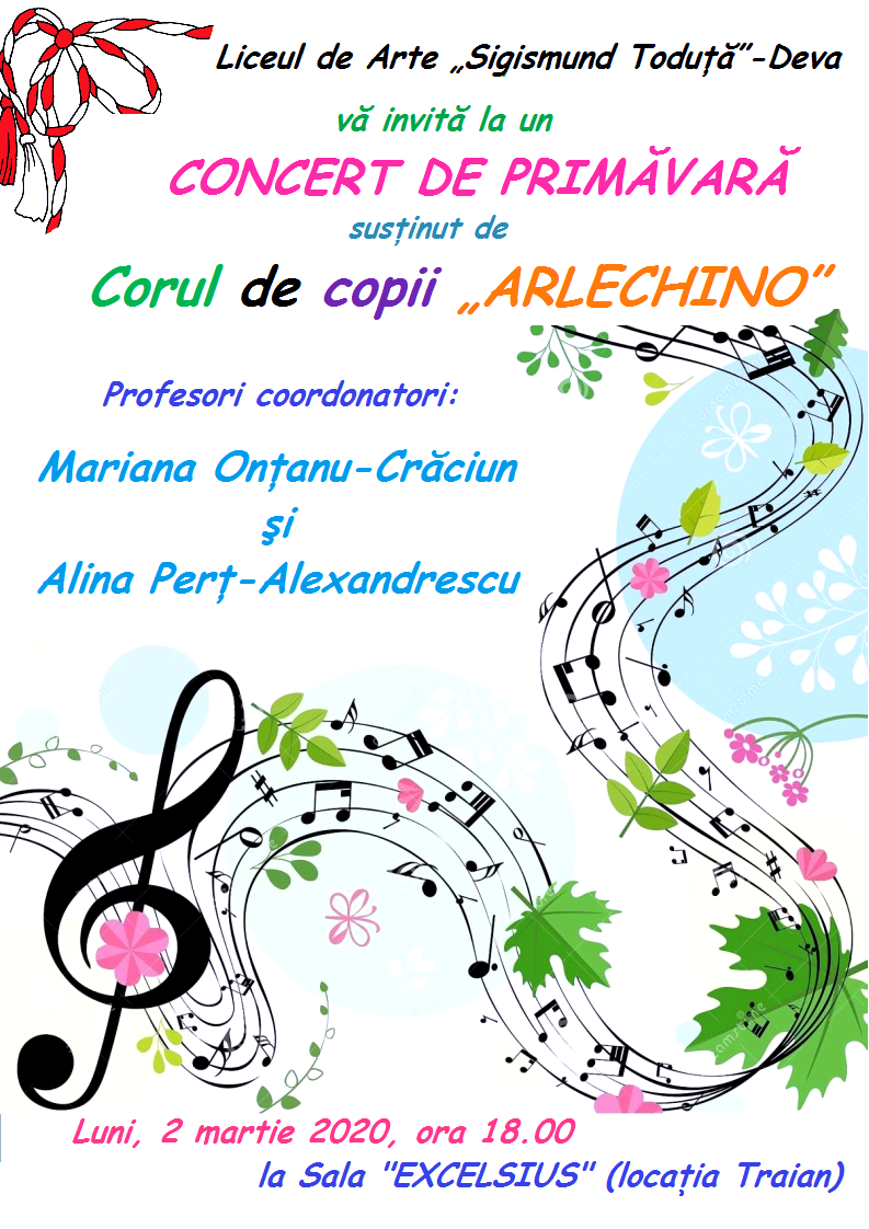 Liceul de Arte “Sigismund Toduță”- Deva vă invită în perioada care urmează să luați parte la două evenimente muzicale dedicate sărbătorilor din debutul primăverii: Mărțişorul şi Ziua Femeii.