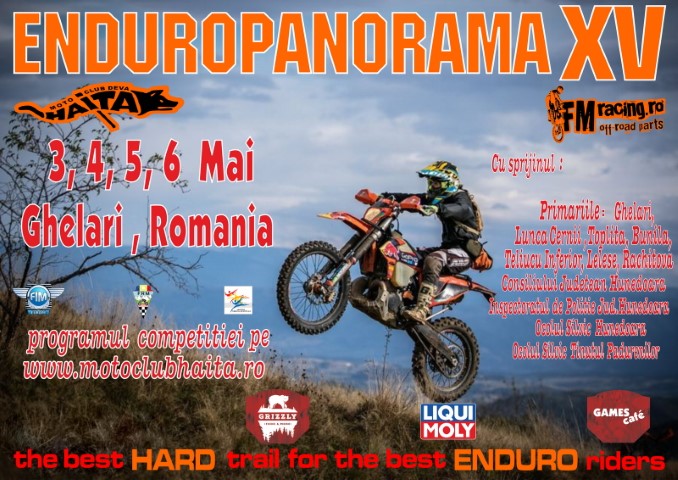 Un eveniment spectaculos cu peste 500 de concurenţi, participanţi de pe trei continente, mai bine de 300 de kilometri de concurs şi zeci de probe speciale – asta îi aşteaptă în acest an pe iubitorii sportului cu motorul. În perioada 3-6 mai, în localitatea Ghelari, judeţul Hunedoara, va avea loc a 15-a ediţie a concursului internaţional de hard enduro „enduroPANORAMA”, organizat de către MOTO CLUB HAITA din Deva.