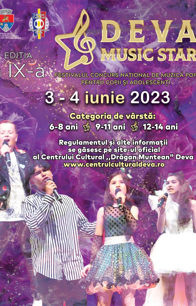 Primăria Municipiului Deva și Centrul Cultural „Drăgan Muntean” Deva organizează în perioada 3-4 iunie 2023, Festivalul Concurs Național de Muzică Pop pentru Copii și Adolescenți „DEVA MUSIC STAR”, ediția a IX-a.