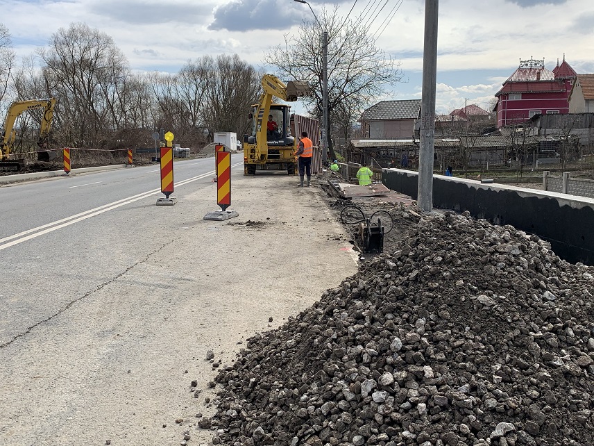 Se lucrează și la supralărgirea bretelei carosabile, la caseta drumului și la fundația parapetului de pe șoseaua pe sensul Sântuhalm – Hunedoara.
