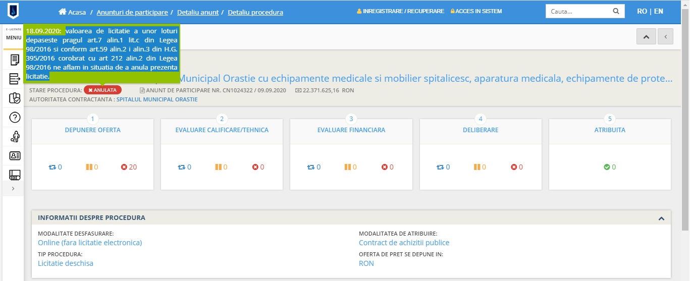 Contractul contestat are o valoare totală de peste 22 de milioane de lei. Potrivit informațiilor de pe SEAP întregul proces a fost anulat sub motivația că ” valoarea de licitatie a unor loturi depaseste pragul art.7 alin.1 lit.c din Legea 98/2016”.
