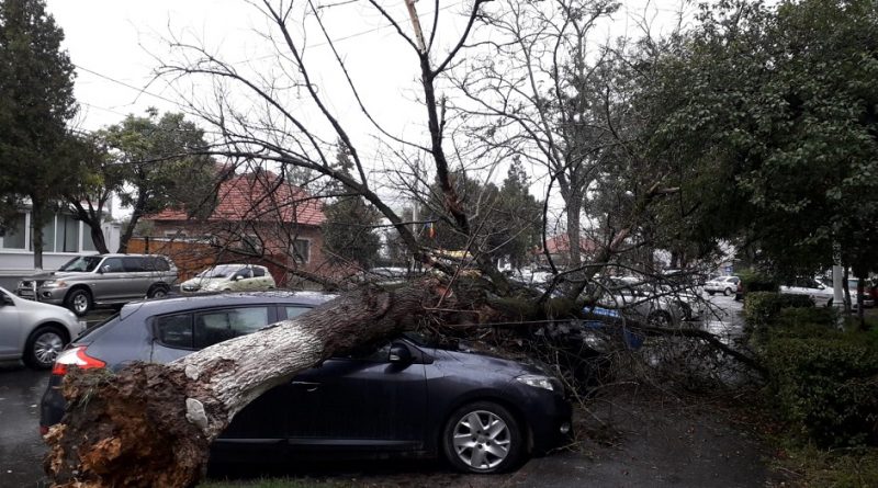 Copac smuls de vânt la Deva, căzut peste maşinile din faţa Inspectoratului Judeţean de Poliție