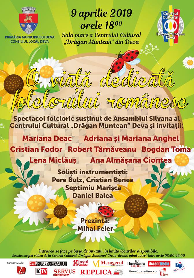 Primăria Municipiului Deva şi Centrul Cultural „Drăgan Muntean” vă invită, marţi, 9 aprilie 2019, la ora 18:00, în sala mare a Centrului Cultural „Drăgan Muntean”, la spectacolul „O viaţă dedicată folclorului românesc”.