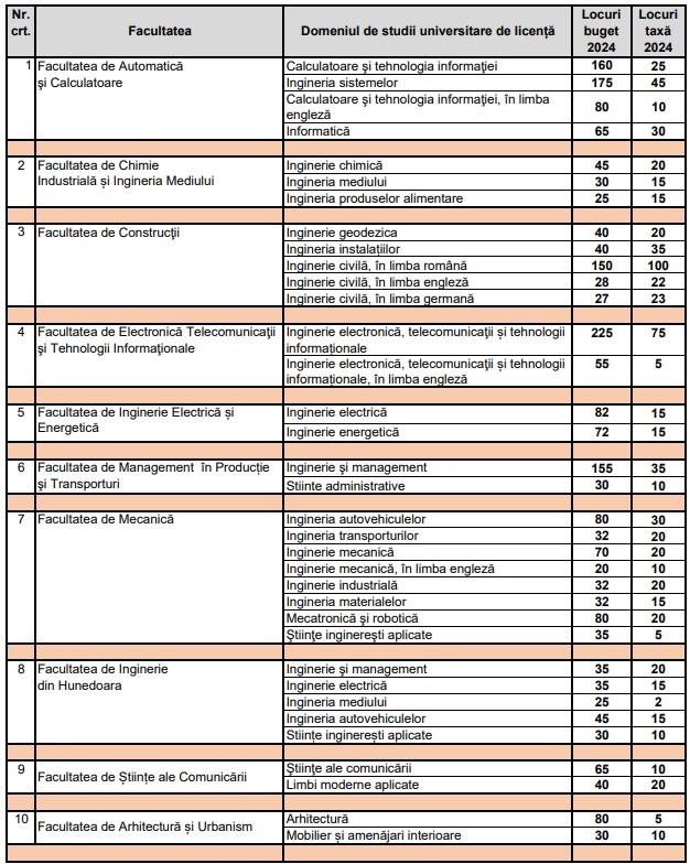 Având în vedere solicitările de pe piața muncii, Universitatea Politehnica Timișoara a decis suplimentarea numărului de locuri la toate facultățile.