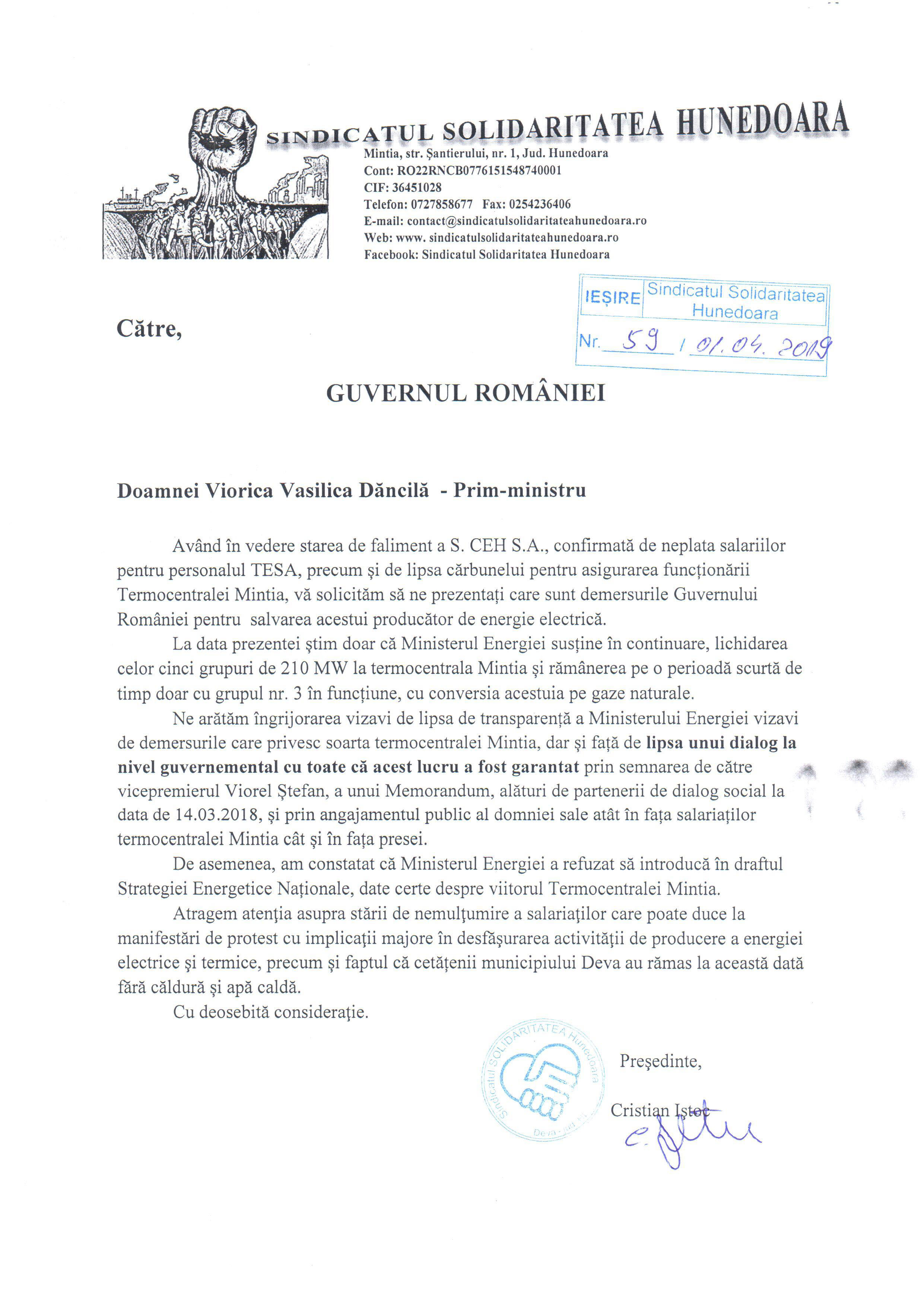 “Având în vedere starea de faliment a SC CEH SA, confirmată de neplata salariilor pentru personalul TESA, precum și lipsa cărbunelui pentru asigurarea funcționării termocentralei Mintia, vă solicităm să ne prezentați care sunt demersurile Guvernului României pentru salvarea acestui producător de energie electrică. La data prezentei știm doar că Ministerul Energiei susține în continuare, lichidarea celor cinci grupuri de 210 MW la termocentrala Mintia și rămânerea pe o perioadă scurtă de timp doar cu grupul 3 în funcțiune, cu conversia acestuia pe gaze naturale”, arată Sindicatul Solidaritatea Hunedoara în adresa transmisă premierului Viorica Dăncilă.