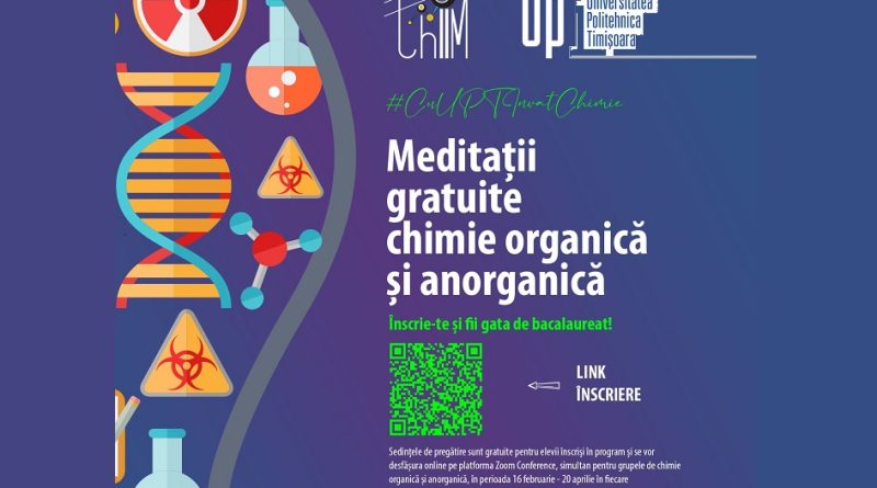După lecțiile gratuite de matematică care se desfășoară până în 27 mai, UPT anunță lansarea lectiilor de chimie. Acest program de meditații gratuite la discipinele Chimie Anorganică și Chimie Organică intitulat „Cu UPT învăț CHIMIE” vine în întâmpinarea elevilor de liceu care se pregătesc pentru examenul de bacalaureat, oferind cursuri gratuite de pregătire predate de cadre didactice universitare de la Facultatea de Chimie Industrială și Ingineria Mediului din cadrul Universității Politehnica Timișoara.