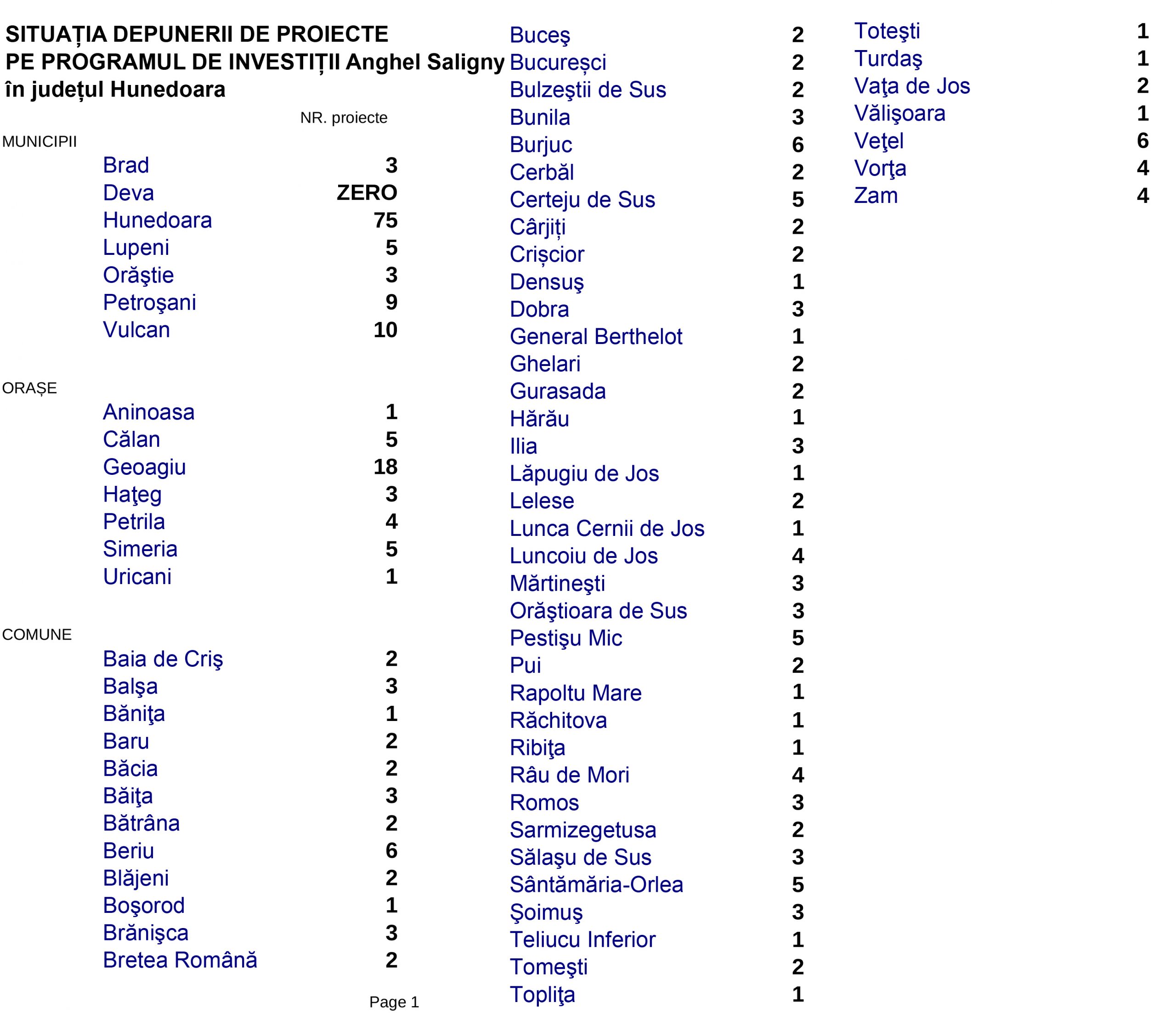Dintr-o regretabilă eroare (preluarea viciată a tabelului de la Ministerul Dezvoltării), eroare pe care autorul articolului și-o asumă integral și cere scuze cititorilor și celor nedreptățiți, în prezentarea noastră câteva primării hunedorene au apărut cu zero proiecte depuse. În fapt, singura localitate hunedoreană fără proiecte eligibile depuse este municipiul Deva. Am reverificat și corectat situația, tabelul corect fiind atașat la finalul articolului. Mea culpa.