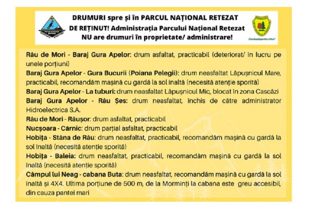 Administrația Parcului Național Retezat mai menționează faptul că nu deține și nu administrează drumuri în sau lângă parc.
