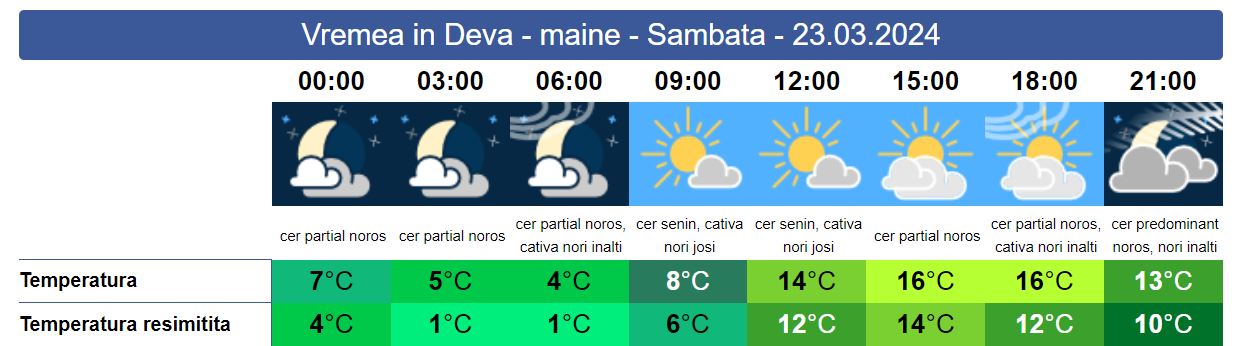 Sâmbătă, în termometre mercurul va crește ușor, valorile termice se vor situa între 14 și 16 grade. Cerul va fi mai mult senin, în prima parte a zilei, apoi treptat va deveni parțial noros. Temperaturile nocturne sunt în creștere.