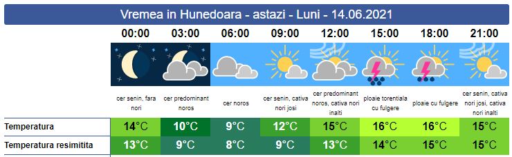 Luni, vremea se răcește. Soarele va răsări la ora 05:36. La primele ore ale dimineții temperaturile vor fi modeste, iar atmosfera va fi schimbătoare. După-amiază, pe arii extinse se așteaptă averse însoțite de fenomene electrice, până spre seară când cerul se va degaja. La munte vântul va sufla mai tare față de restul teritoriului. Soarele apune la ora 21:20. Valorile minime vor fi cuprinse între 9 și 12 grade, iar cele maxime vor situa în jurul valorii de 16 grade.
