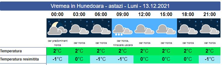 Vremea se răcește semnificativ. Soarele răsare la ora 07:58. Cerul va fi mai mult noros, iar pe alocuri vor cădea ninsori slabe. La munte ninge și se va depune un nou strat de zăpadă. Vântul va sufla slab spre moderat. Soarele va apune la ora 16:45. Temperaturile se mențin constante, în jurul valorii de 2 grade.