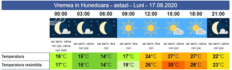 Luni, se anunță cer predominant senin. Soarele răsare la ora 06:30. În zona noastră, vremea va fi frumoasă. Scăpăm de precipitații pentru următoarele două zile și se va încălzi ușor. Soarele va apune la ora 20:34. Temperatura maximă resimțită se va situa în jurul valorii de 28 de grade.