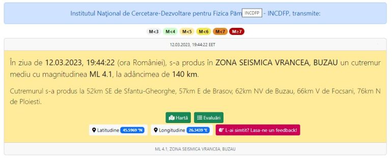 INFP anunță că în urmă cu puțin timp, mai exact la ora 19:44:22, un cutremur cu magnitudinea de 4,1 a avut loc, în zona seismică Vrancea – Buzău, la o adâncime de 140 km.
