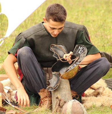 Materia primă e destul de scumpă. Lucrul la o pereche durează cam o oră.” Micuţele încălţări au atras imediat atenţia unei femei plecate la cules de ciuperci şi coborâtă de curiozitate în tabăra dacică. „Sunt minunaţi ca amintiri. Mă gândesc că nu aş cumpăra varianta mare, nu port opinci şi nu are rost, dar piesele astea micuţe merg tare bine într-un colt al casei, poate lângă o lingură de lemn sau obiecte confecţionate tot manual. Eu cred că le voi purta drept brelocuri.” Cristian are şi o pereche de sandalele romane, tot în miniatură: „Sunt diferite şi se vede deosebirea între cele două tipuri de încălţăminte. Oricum, în antichitate, încălţămintea ridica gradul social al unui om.”