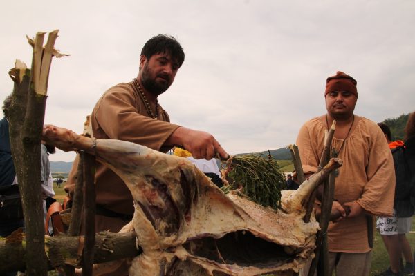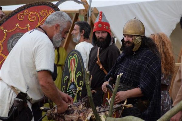 Dincolo de fortăreaţă, în pragul aşezării dacice, câţiva bărbaţi au mare grijă de prânz: „Am pregătit un berbec la proţap în stil dacic, cu cimbrişor, cu plante aromatice şi, după cum vedeţi, are mare căutare”, povesteşte Gigi Sima de la Asociaţia Historia Renascita Piteşti.