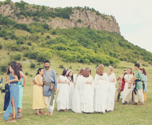 Cosmin Duduc strigă: „Astăzi trebuie să ne bucurăm fiindcă la zei a plecat cineva dintre noi, nu trebuie să jelim! Trebuie să ne bucurăm că a scăpat de lumea asta plină de rele. O să vă reîntâlniţi cu el. De astăzi ne priveşte de sus! Începeţi sărbătoarea!” Dacii ridică braţele şi urale se înalţă peste câmp. „Dacii, în istoria lor, au avut mai multe faze: incinerare, apoi înhumare, urmată de altă fază de incinerare. Trupul celui răposat era ars pe rug împreună cu una dintre soţiile sale, cea mai vrednică. Comunitatea – satul, cetatea – participau la acest ritual şi se bucurau pentru faptul că cel plecat dintre noi e undeva, într-un loc mai bun, între zei. Nu-i prilej de tristeţe sau de boceală, ci trebuie să ne bucurăm, ne bucurăm pentru că ne vom revedea cândva. Dacii credeau în viaţa de după moarte. Nu le era teamă de moarte, ea reprezenta pentru ei doar o trecere, o uşă. După poveţele lui Zalmoxe, ei ştiau că, după moarte, se vor ospăta alături de zei şi de cei apropiaţi, plecaţi mai devreme”, explică Cosmin Duduc ca Mare preot de la Terra Dacica Aeterna.