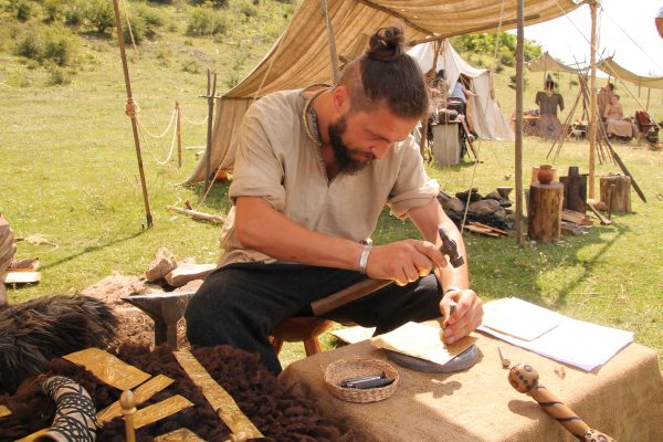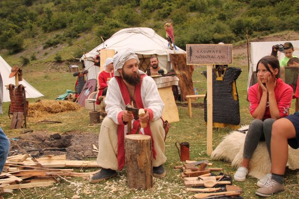 Cel mai calm loc din tabără e atelierul lui Ciprian Pop, unde mirosul de lemn dovedeşte aromele cărnurilor. Ore la rând, dacul potriveşte cutele lemnului după gândurile sale: “Aproape orice făceau dacii din lemn, aş putea spune că era o lume a lemnului – de la ustensile de mâncat – linguri, strachine, la farfurii, construcţii, poduri. Din descoperirile arheologice, au rezultat foarte multe instrumente de prelucrare a lemnului şi de asta presupunem că lucrau lemnul masiv”. Îl poţi admira pe Damanais nu doar pentru priceperea cu care iveşte tot felul de obiecte, dar mai cu seamă pentru migala cu care lucrează şi răbdarea cu care struneşte fiece fibră. La el, poposeşte Alexandru Duduc, unul dintre luptătorii crunţi ai dacilor. Nu-l vezi prea des aşa, dar acum zâmbeşte în timp ce îşi trece lin palma peste un blid frumos de lemn.