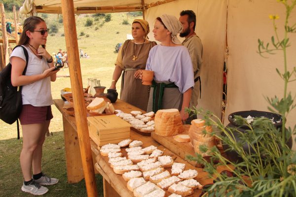 Ziua prinde puteri peste aşezarea dacică – grădinile şi-au trimis verdeţurile în bucătării, copiii se înfruptă din mere, ronţăie morcovi şi trag cu ochiul la femeile care pregătesc deja prânzul. Aromele sunt puternice: “Coriandru, usturoi şi verzituri: rută, ţelină. Punem sare şi piper”, povesteşte Ştefania în timp ce pregăteşte amestecul pentru moretum, pasta de brânză care a adus parte din faima culinară a celor din Asociaţia Terra Dacica Aeterna. Puştii dau târcoale mesei de unde şterpelesc pesmeţi pe care se chinuie apoi să-i roadă.
