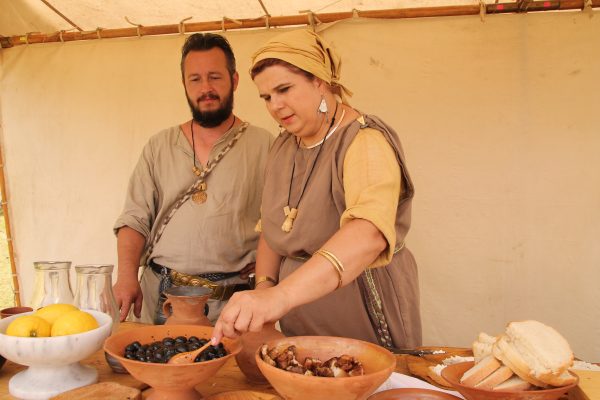Ediţia aniversară, Dac Fest X, are atât de mulţi vizitatori că oamenii se înghesuie la fiecare atelier, dar la mâncare fac de-a dreptul coadă. “La bucătăria antică avem o carne dacică de porc cinstită cu sare, pe grătar; avem pesmeţi romani, cu făinuri integrale de grâu şi secară, avem şi moretum-ul pe care toată lumea îl cere. E pasta de brânză cu usturoi şi plante aromate, inclusiv rută. Mai pregătim un pui cu smântână şi salvie, o reţetă daco-romană. Sunt măsline cu miere şi urmează o reţetă de ouă, cu seminţe, după Apicius”, zice Angelica Bălos.