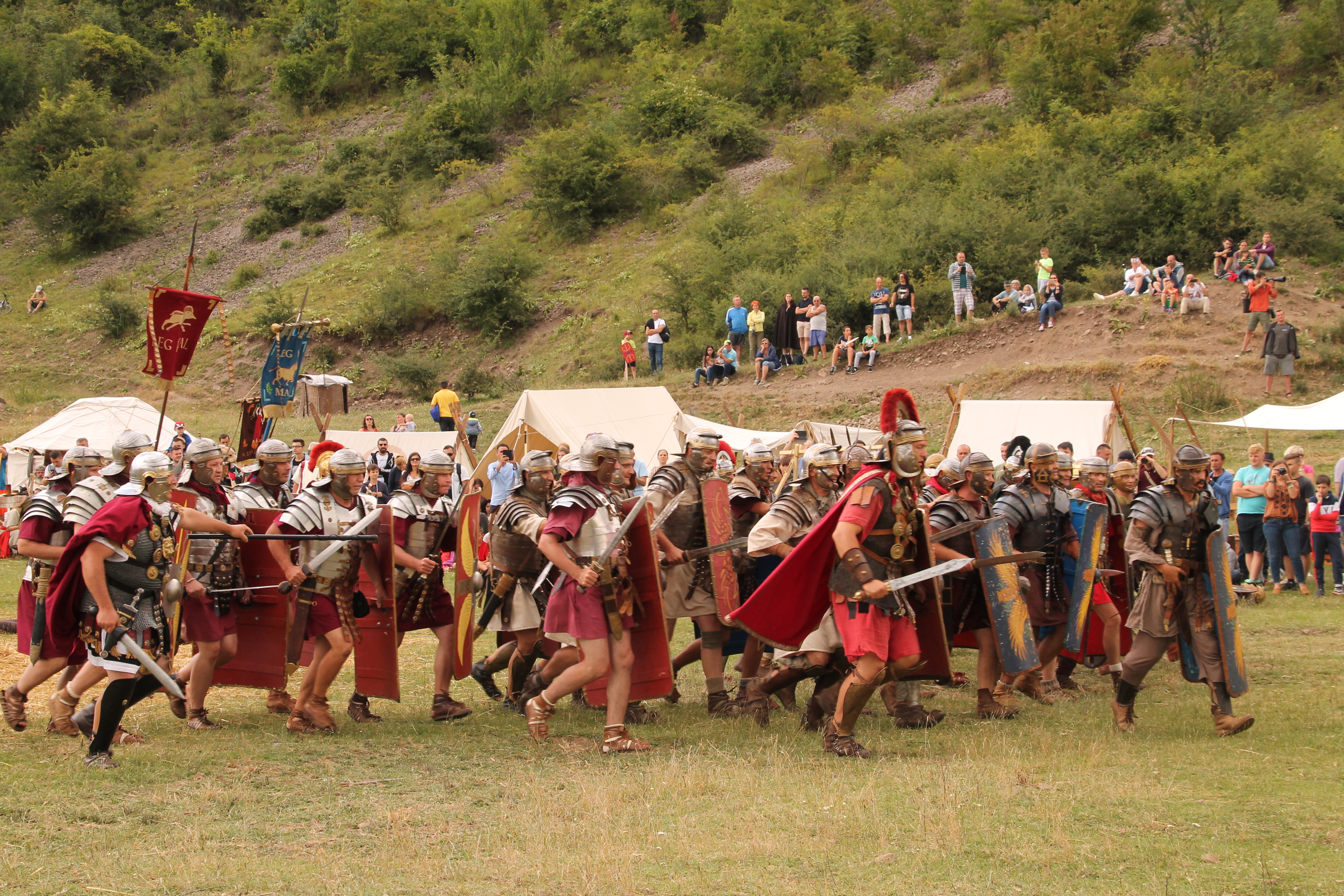 Arcaşii daci şi sarmaţii trag săgeţi, dar legionarii sunt într-o formaţie specifică de apărare şi fac corp compact cu scuturile lor. „Dacii strigă insulte indecente la adresa romanilor care se adună într-o testudo, o formaţiune prin care se pot apropia de trupele inamice. Se străduiesc ca formaţiunea să rămână compactă. Romanii ştiu să facă asta cu măiestrie, în asta a stat succesul lor sute de ani – o armată profesionistă şi bine pregătită”, aude publicul. Oamenii îşi încurajează favoriţii: romanii reuşesc să intre în defileu, dar sunt atacaţi din toate părţile.