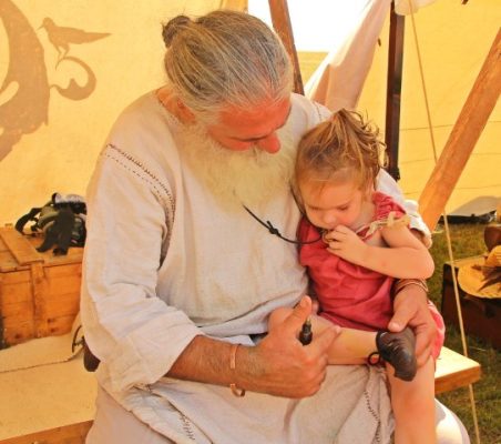 Alături, Mugur Pop îşi farmecă publicul nu doar cu înfăţişarea sa mândră, ruptă parcă din Antichitate, ci cu cunoştiinţele sale despre ierburile de leac. Ştie, ca nimeni altul, să atragă cu istorisile sale şi atenţia copiilor, nu doar a micuţei sale pe care o alintă dulce „Bibi”: „Ia, arată tu ce avem aici”, o îndeamnă dacul pe fetiţa care îl priveşte serios, cu doi ochi mari şi albaştri.