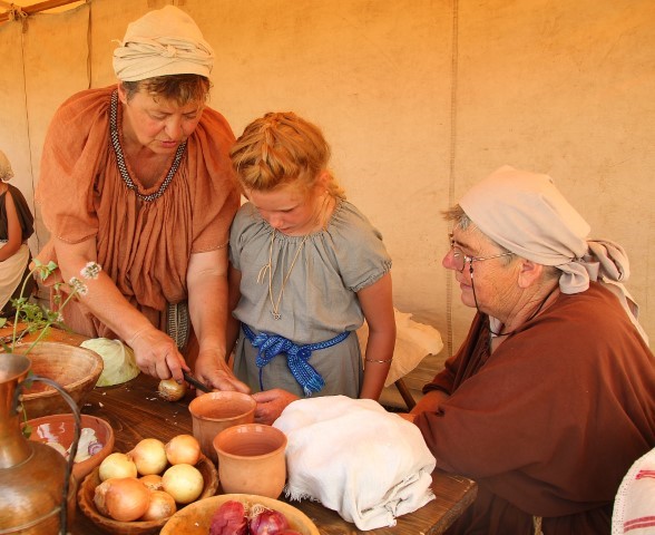 La bucătărie, este din nou plin de oameni care vor să încerce gusturi diferite, să noteze condimentele şi să savureze felurile romane unde dulcele este amestecat cu sare şi piperul dă nobleţe mierii. Fotograful Florin Muntean pare a fi peste tot cu obiectivul şi probabil că nu este reenactor să nu aibă măcar un cadru surprins de el în festival.