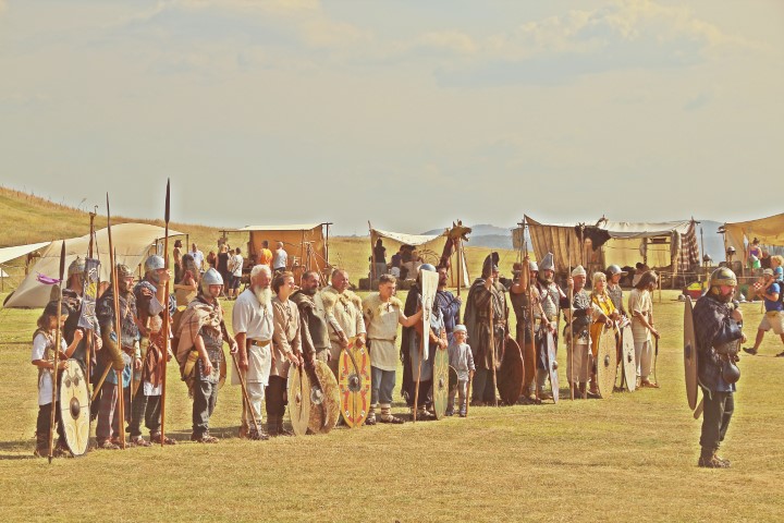 Gladiatorii se ţin deoparte alături de reenactorii din Anglia care poartă costumaţia de daci.