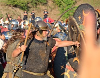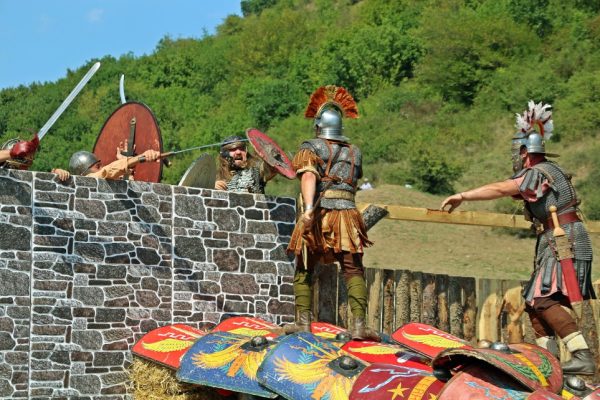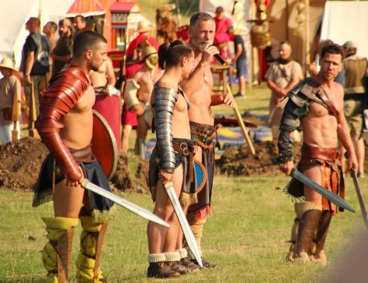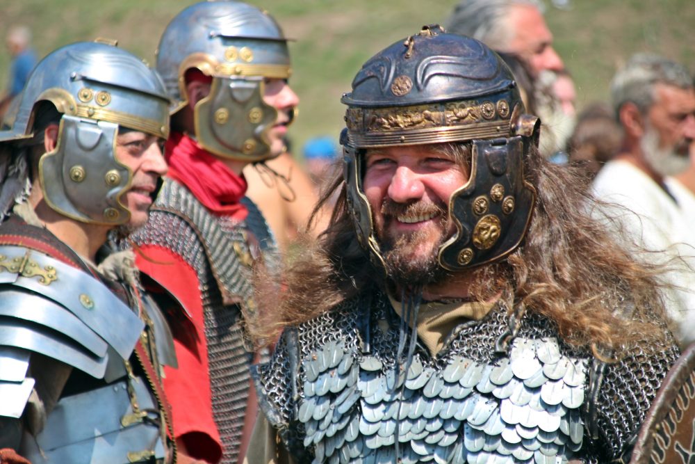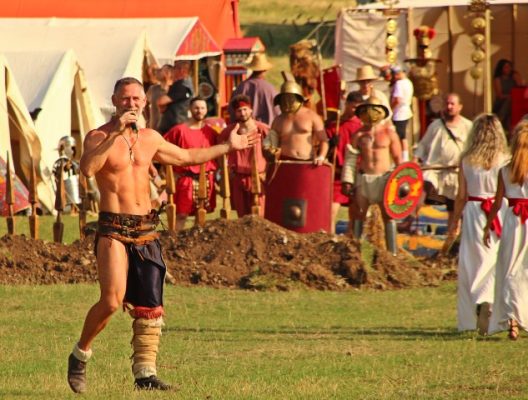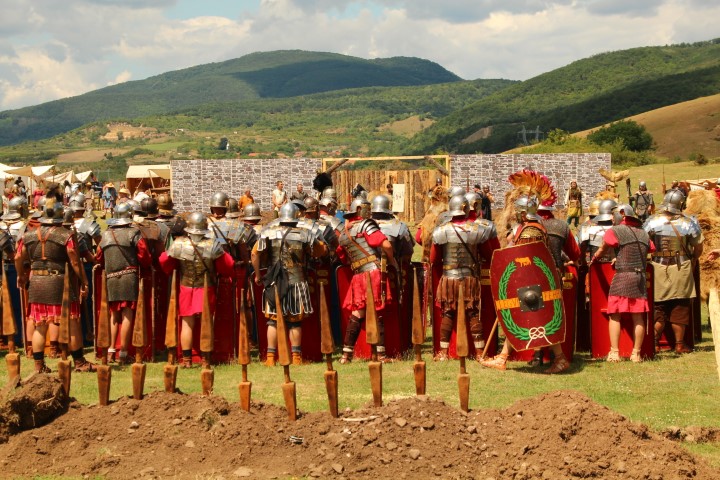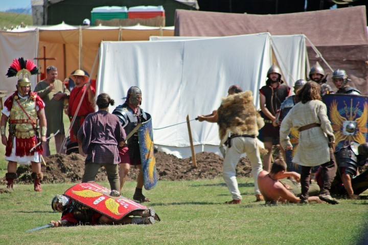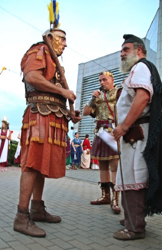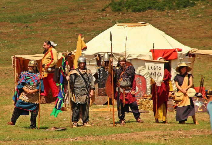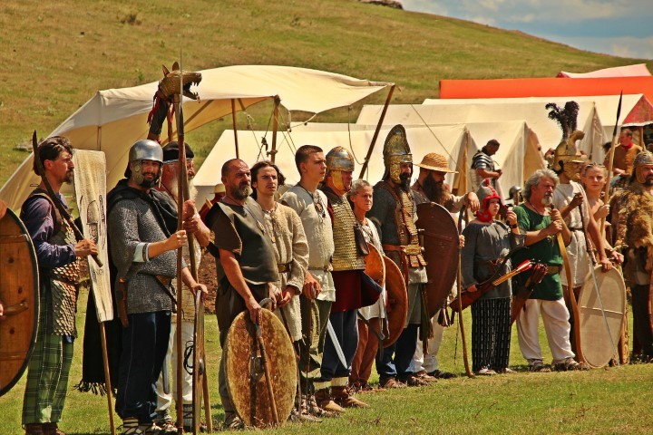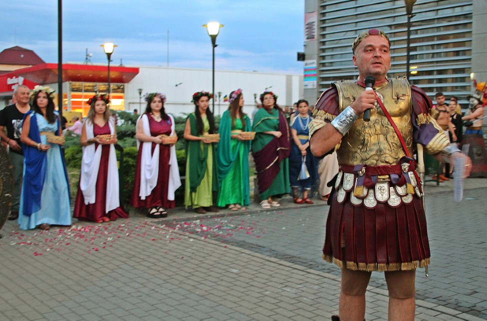 Îmbrăcaţi în straie croite după modele antice, zeci de reenactori se apropie de locul unde istoricul Tudor Roşu din Alba Iulia, el însuşi îmbrăcat în uniformă romană de gală, anunţă programul şi participanţii, vorbeşte despre trupele de reconstituire istorică din festival, despre romani şi gladiatori, despre daci, sarmaţi sau alţi barbari.