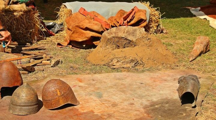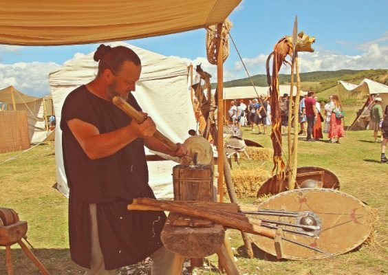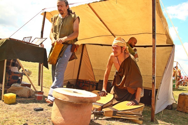 Întreg locul se umple de acorduri antice, de la primul atelier specializat pe muzica vremii. În preajmă, Dumitru Ursu meșterește atent la un scut și îi prinde marginile acoperite în piele. Mai peste tot oamenii și lucrurile se pun în mișcare: roata olarului, strungul antic, atelierul de tatuat, cel de pielărie, iar focul se încinge lângă bucătărie și atelierul de turnat bronz.