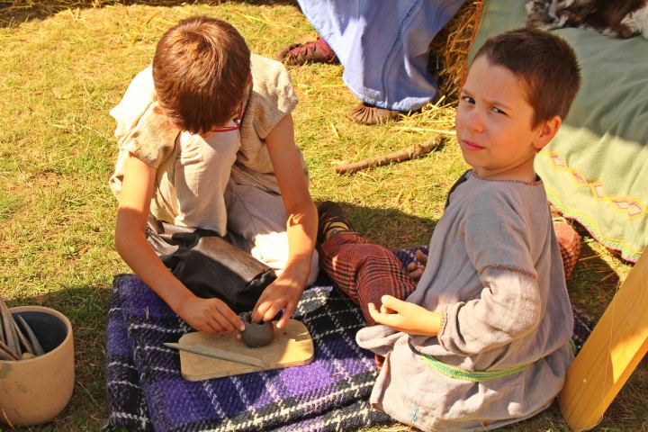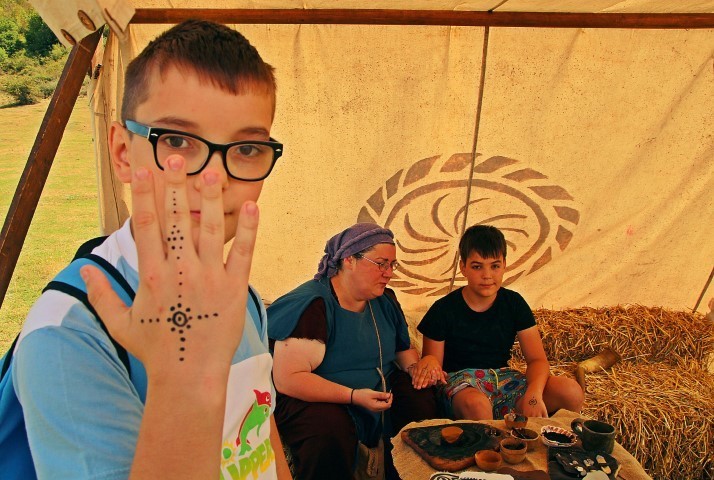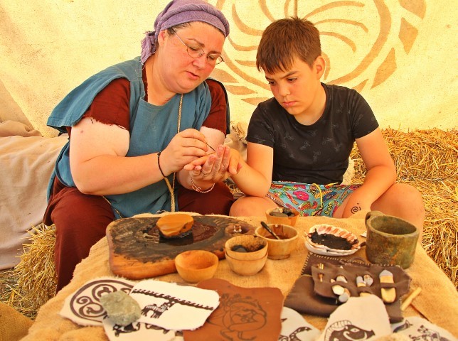 Ramona Jurca îți arată cum se scria în imperiu, pe tăblițe de ceară sau pe pergament, un pergament realizat din piele chiar de unul dintre meșterii asociației. Copii curioși vin să asculte, să încerce totul, apoi rămân o vreme zdravănă la jocurile romane.