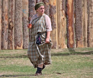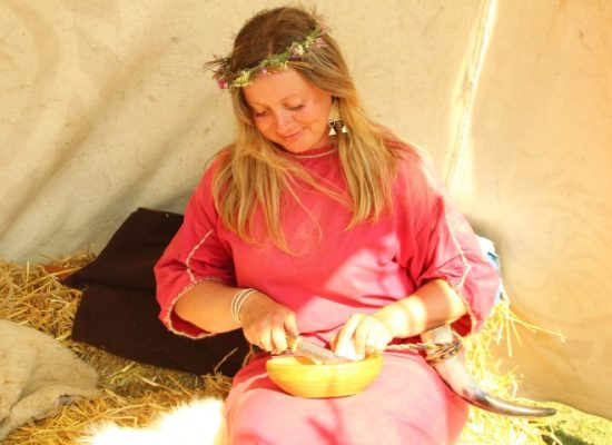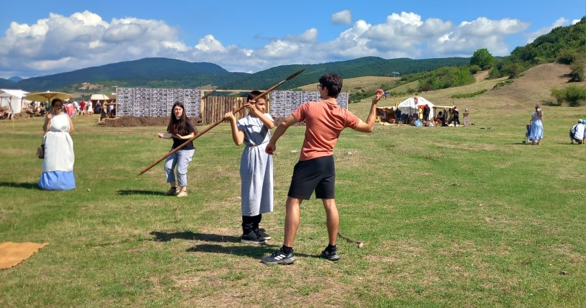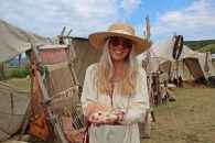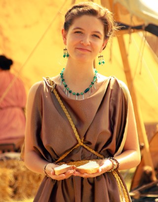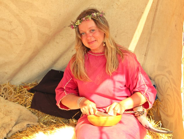 Îmbrăcată ca o dăciță, tânăra a venit la festival și participă activ: „Reproducerea după furca romană realizată din os este uimitoare.