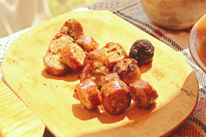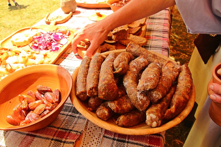 Se numesc cârnaţii de Lucania, pentru că provin din regiunea de sud a Italiei. Vorbim de un gust al cârnaţului total diferit de ceea ce ştim noi azi: nu am folosit usturoi, nici cimbru, dar am pus în schimb multe seminţe de pin, chimen, boabe de ienupăr, pătrunjel. Are în comun cu cârnaţul de astăzi doar piperul.”