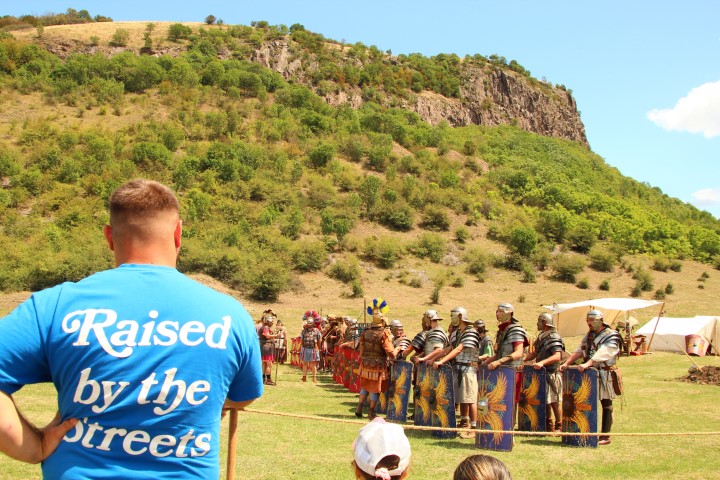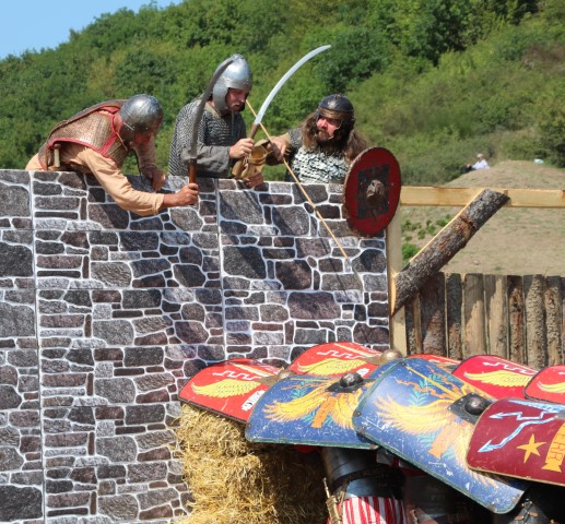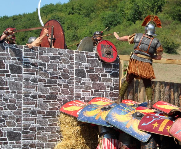Lângă fortăreața dacică se întâmplă ceva tare interesant şi nemaivăzut la DacFest. Când se apropie de porţi, centurionii de la trupele românești împreună cu cei de la Legio I Italica veniţi din Bulgaria le ordonă soldaţilor să formeze o testudo, în aşa fel încât ei să se poată urca ca pe o scară pe zidul apărat de straşnicul Daos, alias Marius Barbu, care păzește zidurile alături de copilul său.