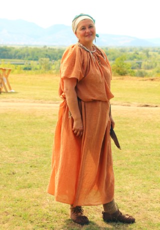 Dacă vorbim de înalta nobilime, iată această femeie – arată prezentatorul către Raluca Drăghici de la Historia Renascita -, cu cele două slujitoare ale ei, care îi satisfăceau tabieturile, poate eticheta care însoţea această funcţie, de soţie a unei căpetenii apropiată de casa regală. Poartă haine care sunt refăcute după cele de pe Columna lui Traian. În ultimii ani s-au făcut multe cercetări asupra pigmenţilor cu care a fost vopsită Columna. Ea nu arăta ca un fus alb cum este acum, era colorată cu pigmenţi naturali. A rezultat o paletă de culori pe care o şi vedeţi aici. Poartă argint, dar cred că are şi ceva aur, are cercei, brâu, brăţări… S-ar putea, la cât este de bogată, să aibă şi ceva de spus. Slujitoarele sunt probabil rudele ei mai de la ţară : nu sunt nici ele nişte sărace.”