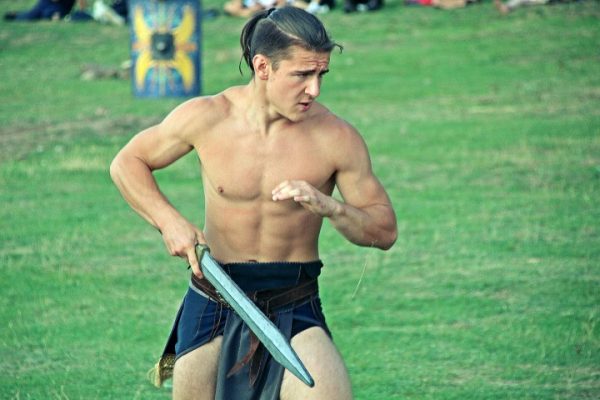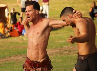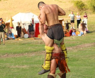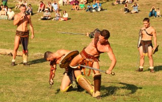 Şcoala de gladiatori „Ludus ursus” de la TDA vine cu luptători diferiţi: „Toate echipamentele pe care le vedeți sunt reconstituiri după diferite fresce de epocă”. Înfruntările sunt destul de dure dacă te iei după urmele lăsate pe piele. „Ia, ce mână are ăla!”, strigă un puşti speriat când vede echipamentul greoi care îmbracă întreg braţul.