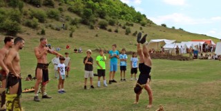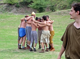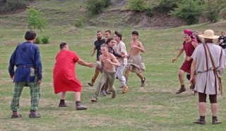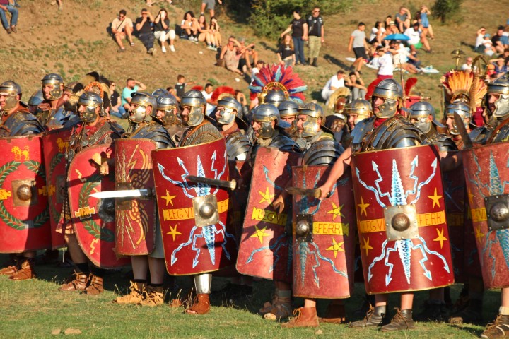 Centurionii strigă: „Îndoiţi genunchii, cei din zona asta! Mai jos! Voi, în genunchi!”. Nu înţeleg ce zic bulgarii, dar, de sub grămada de scuturi, se aude un „Sorry”, se icneşte şi cineva chiar scapă o înjurătură. Nu este ceva obișnuit în festival, dar nu e simplu să stai chircit, chiar dacă imaginea este de-a dreptul spectaculoasă. „Ai, ce fain!”, strigă Marius, apoi se face că doboară cu suliţa centurionii care au urcat şi aşa destul de greu pe scuturile făcute pod.