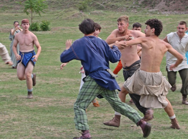 Oamenii de pe margine se distrează oricum de minune cu spectacolul din teren. Partida s-a încins aşa tare că de-abia mai vezi unde este balonul antic, oricum jucătorul care are mingea riscă mereu să devină o chinuită bază a unei grămezi de trupuri.