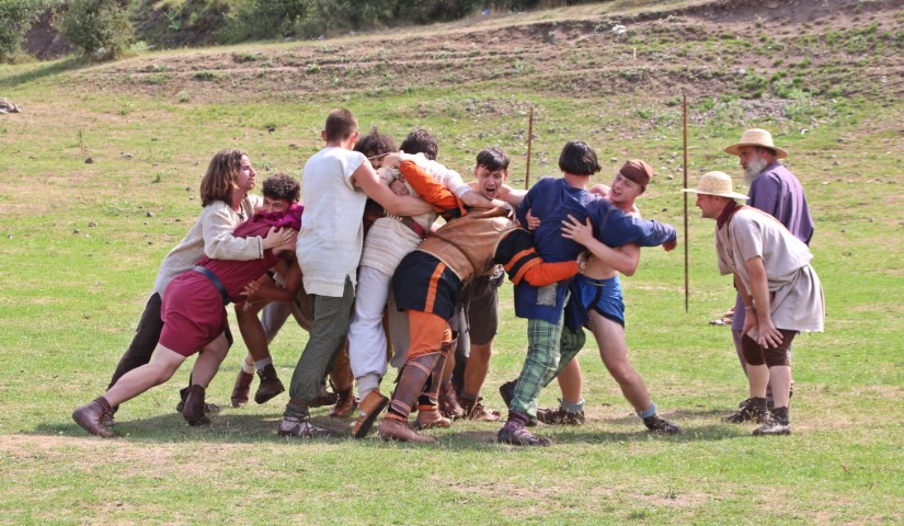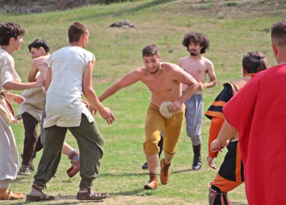 Terenul de joc este cam jumătate din cel de luptă, iar porţile sunt marcate din două suliţe înfipte straşnic în teren. O mică provocare despre aruncatul pietrei îi stabileşte pe cei care vor arunca primii mingea, apoi jocul izbucneşte în forţă: lung şi subţirel, Alesio goneşte cu mingea, aruncă şi: „Goool! Din prima fază! Extraordinar! Din secunda cinci…”, exclamă prezentatorul, apoi lucrurile se dezlănţuie de-a dreptul: plouă cu îndemnuri: “ia-o, trage, luaţi-o!” se aud tot felul de îndemnuri.