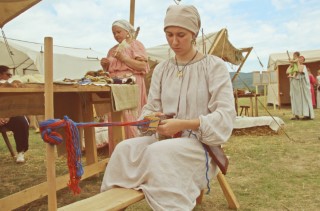 După ce a terminat cu atelierul de împletit părul, Ioana Ureche trece la ţesutul cu tehnica tăblițelor, în timp ce Gabriella Leonte întinde firele pentru războiul de ţesut vertical.