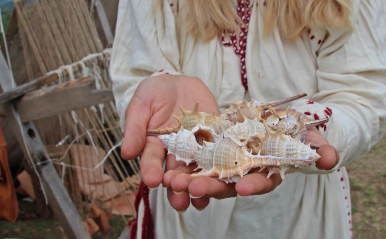 În tabăra celor de la Omnis Barbaria, atenția vizitatorilor este atrasă de câteva scoici, iar arheologul Alina Iancu le explică: „Scoicile acestea ţepoase ne aduc aminte de purpură în spațiul mediteranian. Sunt, de fapt, niște melci marini care se numesc „muricide”, sunt mai multe specii folosite pentru a obţine coloranţi în Antichitate.