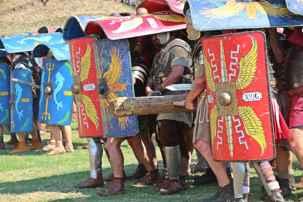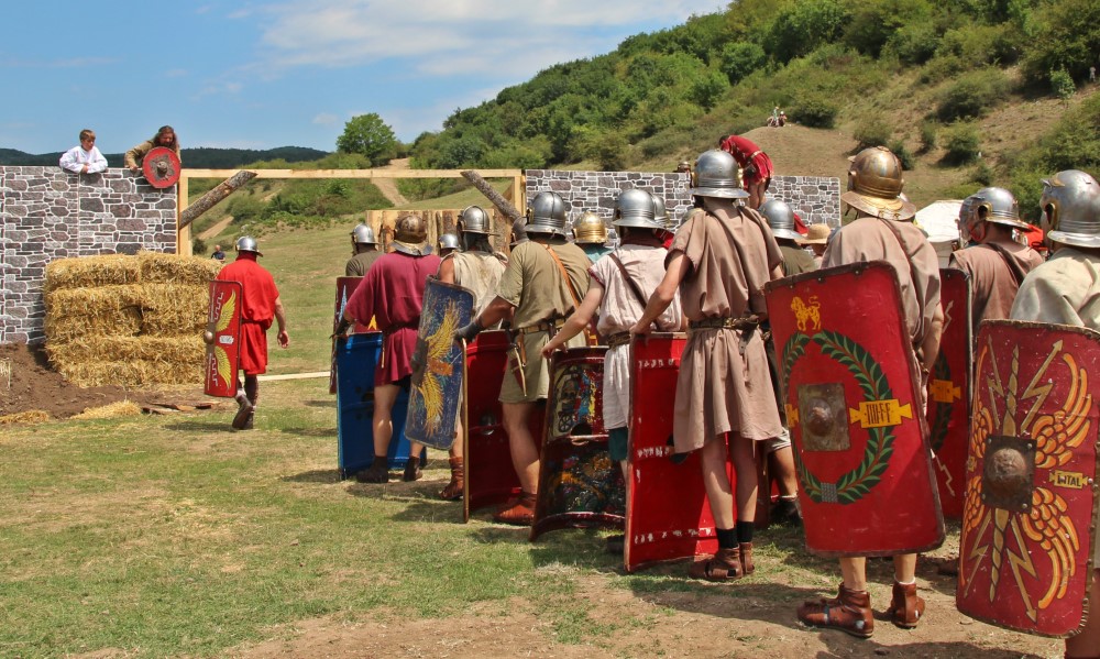 Bărbaţii îşi ridică rapid scuturile aproape şi aşteaptă următorul ordin. „Ad gladius clin!”, îi face pe toţi să se întoarcă la dreapta. Când pornesc, zgomotul metalic şi cadenţa paşilor te face să te înfiori.