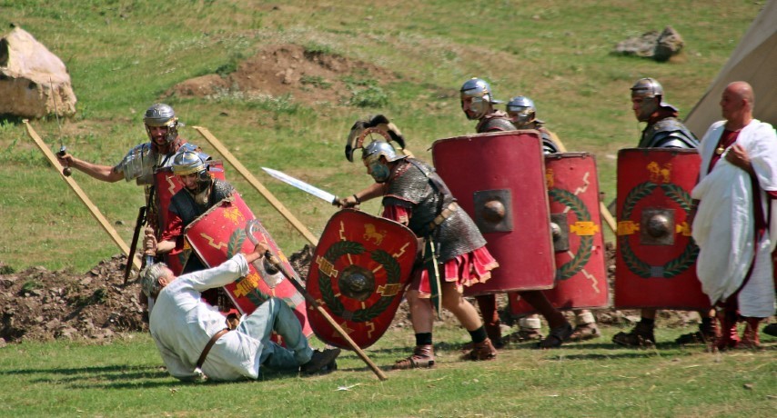 În tabăra romană, pregătirile se văd de departe: soldaţii ies din umbra corturilor şi se orânduiesc să iese în faţa publicului: se îmbracă armurile grele, se aşează căştile, se ridică scuturile, apoi centurionii îşi încolonează legionarii. Cineva dintr-un cort strigă: „Succes, vă doresc!” şi cu asta s-a terminat momentul vorbelor bune.