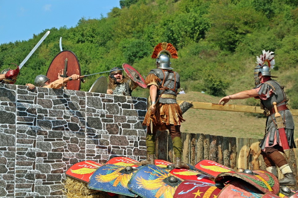 Lângă fortăreața dacică se întâmplă ceva tare interesant şi nemaivăzut la DacFest. Când se apropie de porţi, centurionii de la trupele românești împreună cu cei de la Legio I Italica veniţi din Bulgaria le ordonă soldaţilor să formeze o testudo, în aşa fel încât ei să se poată urca ca pe o scară pe zidul apărat de straşnicul Daos, alias Marius Barbu, care păzește zidurile alături de copilul său.