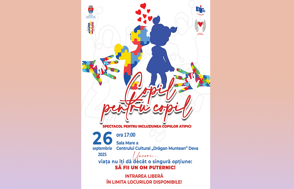 Vineri, 26 septembrie 2025, de la ora 17:00, Sala Mare a Centrului Cultural „Drăgan Muntean” din Deva va găzdui un spectacol cu totul special: „Copil pentru copil”, un eveniment dedicat incluziunii, empatiei și prieteniei adevărate.